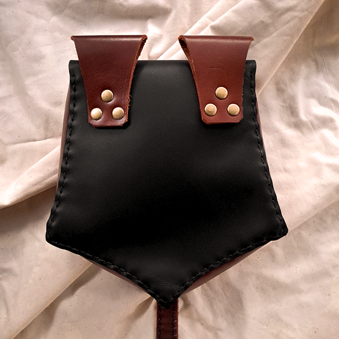 Esta confeccionado en tres piezas, lo que hace que tenga el tamaño ideal para llevar un celular y otras cosas esenciales. Es estilo faltriquera o sporran,  por lo cual se lleva a la cadera o cintura con un cinturón (no incluido).